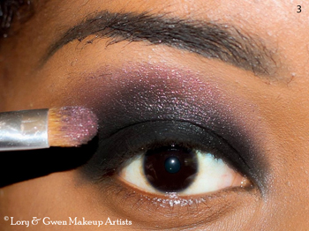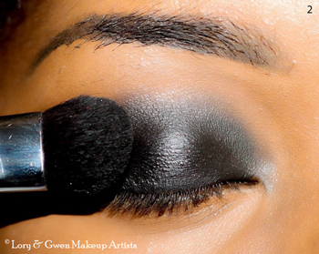 2 - Appliquez un "jumbo"noir ( gros crayon ) sur toute la paupière mobile ; Recouvrez celui-ci avec un fard à paupière noir à l'aide de votre gros pinceau "applicateur" (voir photo) afin de fixer et structurer la forme.