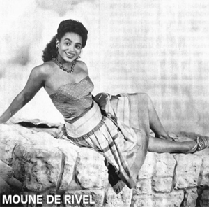 Moune est une véritable artiste, entre radio, télévision, cinéma et presse écrite elle aura connu toutes les formes de communication, s’en servant toujours pour parler des siens, de sa culture. Dans les années 50 sa voix baigne les ondes à travers son émission Charmes de Paris rediffusée aux Antilles le dimanche matin au « pipiri » chantant, la voix de la Rivel alors saluait toutes les Caraïbes. Devenue parisienne, je me rappelle encore de mon rdv dominical avec elle en regardant le feuilleton de l’ORTF Paul et Virginie dans lequel elle jouait le rôle de Marie au côté de la jeune Véronique Jannot. Ce fut d’ailleurs un des principaux feuilletons de la troisième chaine durant les années 70. Moune de Rivel a joué au côté de Alain Delon, Michèle Morgan, Jean-Louis Trintignant et Jean Marais.