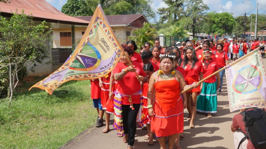 Des Amérindiens de Saint-Georges de l’Oyapock défilant dans la rue lors de la journée internationale des populations autochtones. Des Amérindiens de Saint-Georges de l’Oyapock défilant dans la rue lors de la journée internationale des populations autochtones. © Crédit Photo CTG