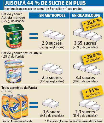 *Selon les études – cf – Rapport fait au nom de la Commission des Affaires Sociales sur la proposition de loi par M. Victorin Lurel visant à prohiber la différence de sucre entre la composition des produits manufacturés et vendus dans les régions d’outre-mer et celle des mêmes produits vendus dans l’hexagone.
