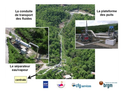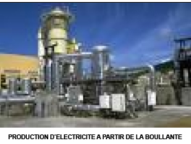 L’usine a été conçue en deux phases. En 1984, Bouillante 1 produisait 5MWe. Difficultés, arrêts, reprises. En 2000, reprennent des forages exploratoires qui conduiront à une nouvelle usine en 2005. Dès que Bouillante 2 a été mise en service produisant 15 MWe, le projet n’avait plus rien d’un prototype. Sur le site qui domine l’usine, trois forages sortent de terre une eau à 250°. L’eau est alors séparée de la vapeur qui, conduite aux turbines va produire de l’électricité, revendue à EDF qui la transporte vers Baie Mahaut et Pointe Noire. Récemment il a fallu réévaluer les tarifs d’achat par EDF pour couvrir les frais d’exploitation.