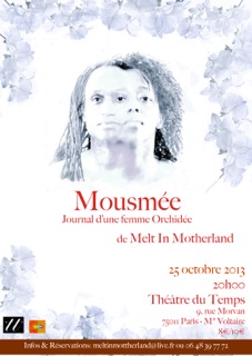 **Mousmée Journal d’une femme Orchidée de Melt In Motherland (création poésie acoustique et chorégraphique) – Le 25 octobre 2013 au Théâtre du Temps – 9 rue du Morvan 75011 Paris. Infos et réservations : Cette adresse e-mail est protégée contre les robots spammeurs. Vous devez activer le JavaScript pour la visualiser. – tél : 06 48 39 77 72