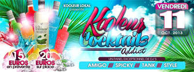 Ven 11 Oct : Soirée “Kooleur de Cocktail addict” (Soirée Clément Cocktail). Le concept : un éventail de cocktails Clement à découvrir ou à redécouvrir (Blue, Red, Pink, Gold, Green)