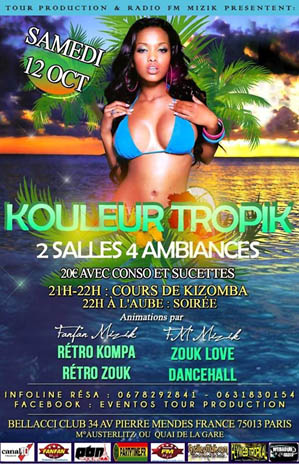Sam 12 Oct: Soirée « Kouleur Tropik» : 2 salles / 4 ambiances de 22h à l’aube (Rétro Kompa, Rétro Zouk, Dance-Hall, Cours de Kizomba)
