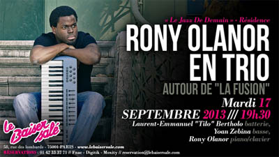 Mar 15 Oct : La Route continue pour « Rony Olanor» : La saison continue ! Après le premier Voyage du 17/09, Rony Olanor sera de nouveau au Baiser Salé en Trio avec cette fois-ci avec Ouriel Ellert et Martin Wangermée. Ils exploreront un répertoire pour lequel il y a 90% de compositions électriquement originales. Se joindra à eux Le brillant accordéoniste Laurent Derache. Un premier "pas" à venir découvrir, pour cette deuxième soirée.