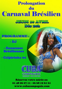 Le carnaval brésilien revient de plus belle. Pour les amateurs de samba cette soirée est pour vous. A ne rater sous aucun prétexte ! Cuba Compagnies vous réserve des surprises pendant toute la soirée et des Caïpirinha seront offert à moitié prix. Chaleur caliente...